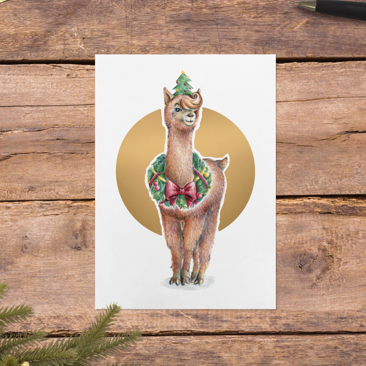 Weihnachtskarte mit lustigem, aber hoch-stylischem Alpaka-Motiv. Illustration in Buntstift, digital manuell nachbearbeitet. Der Druck auf 300g/m PEFC Papier mit seidenmattem finish ist 4-farbig plus Sonderfarbe (matt) gold.