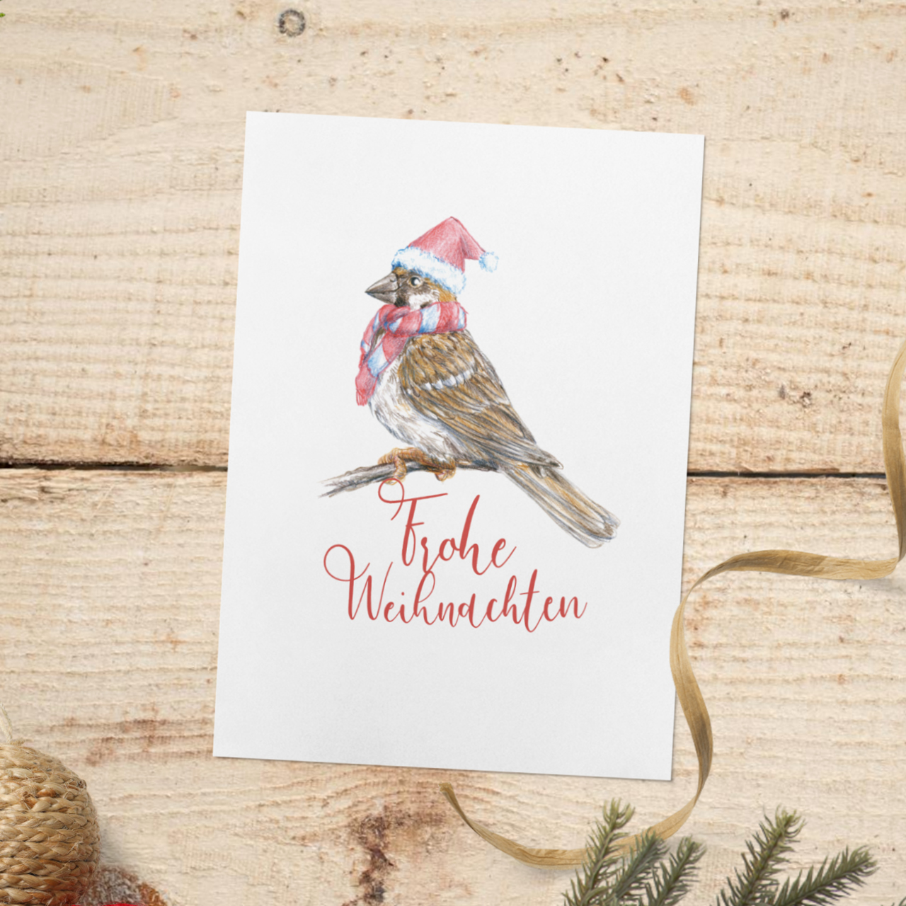 Weihnachtskarte mit Spatz-Motiv und dem Schriftzug ‚Frohe Weihnachten‘. Illustration mit Buntstiften, digital manuell nachbearbeitet. Gedruckt ist das Motiv auf mattem 300g/m PEFC Papier, der 4-farbige Druck hat ein seidenmatt-glänzendes finish.