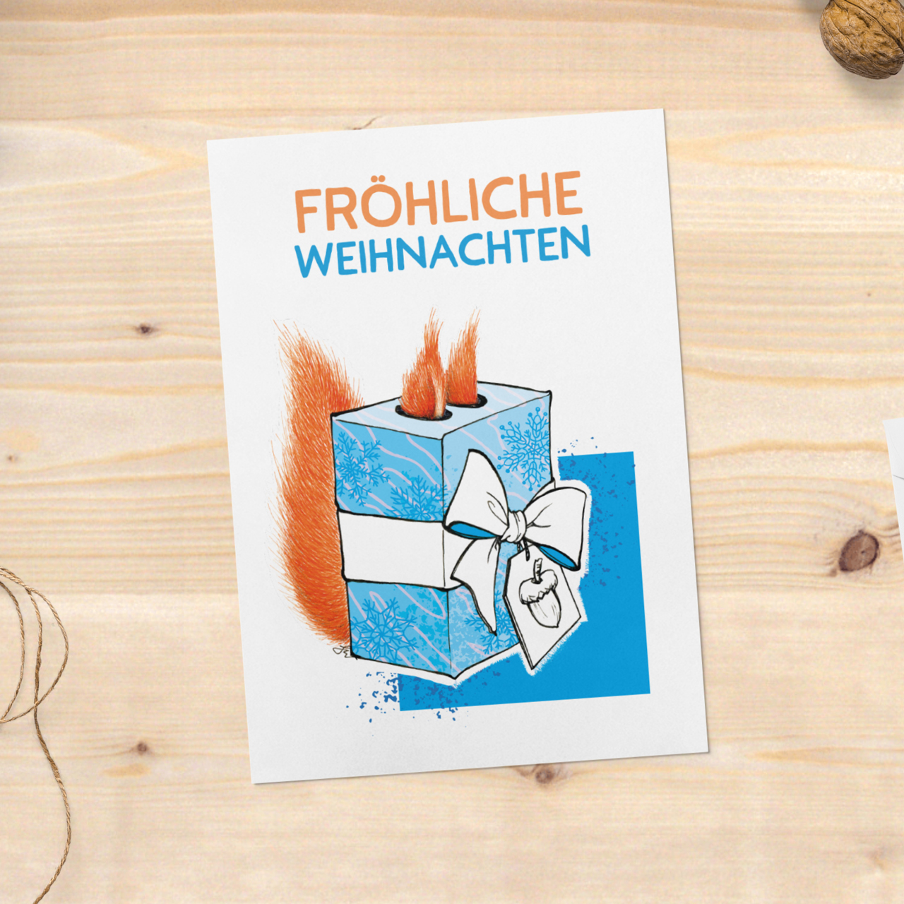Weihnachtskarte mit Eichhörnchen-im-Geschenk-Motiv und dem Schriftzug ‚Fröhliche Weihnachten‘. Illustration in Mischtechnik mit Buntstiften, Marker und digitaler Illustration. Gedruckt ist das Motiv auf mattem 300g/m PEFC Papier, der 4-farbige Druck hat ein seidenmatt-glänzendes finish.