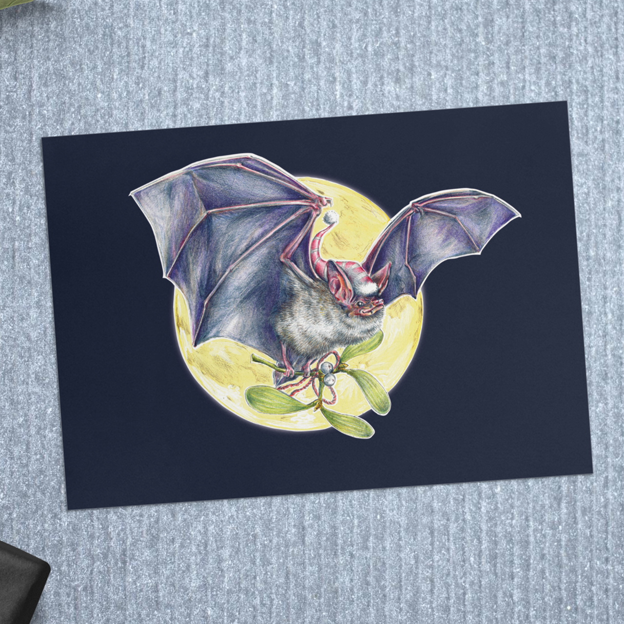 Weihnachtskarte mit einem schönen Fledermaus-Motiv. Illustration in einer Mischtechnik mit Buntstiften und Tempura, anschließend digital manuell nachbearbeitet. Das Motiv ist 4-farbig auf zertifiziert nachhaltigem 350g/m Papier (PEFC) gedruckt. Das Papier ist ungestrichen, matt und sehr gut beschreibbar.